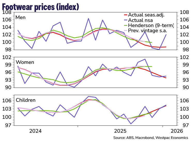 A key upside surprise was in clothing & footwear which gained 2.9% in the month compared to our estimate of 0.1%. Most of this discrepancy was due to garments which lifted 2.2% vs. Westpac’s expectation for a seasonal –1.6% decline. Also of note was a robust 4.2% increase in footwear for men and a 5.7% gain in accessories.