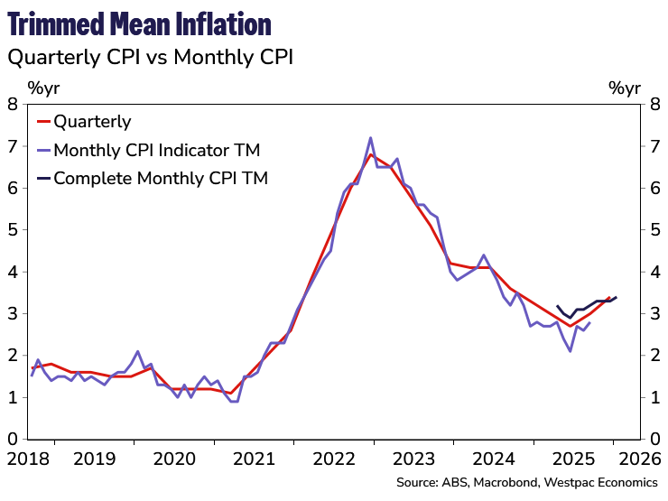 The Monthly Trimmed Mean (TM) measure was up 3.4% in the year to January, Westpac and the market had estimated 3.3%yr, which is up a touch from 3.3%yr in December.