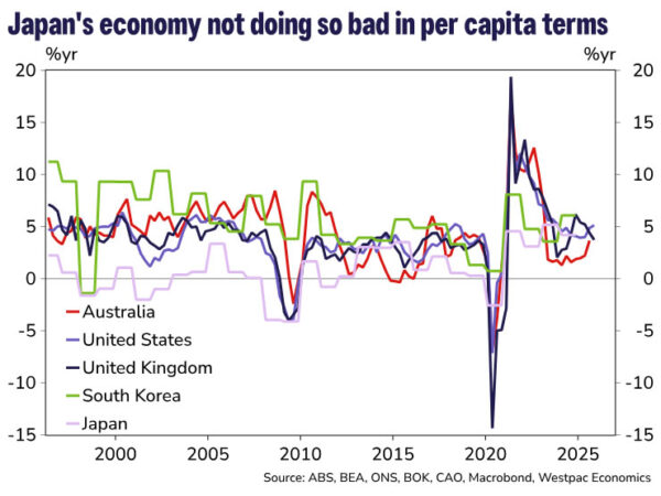 Some may point to Japan’s 1.0% real GDP growth as evidence that it cannot grow out of debt, but this overlooks the drag from a declining population. Adjusting for demographics, per‑capita GDP grew by 4.2% in 2024, broadly in line with the US, UK, South Korea and Australia. With government spending largely tied to population growth rather than headline GDP, modest aggregate growth need not imply deteriorating fiscal dynamics. While population ageing will place upward pressure on social spending, this is likely to be partly offset by arising participation.