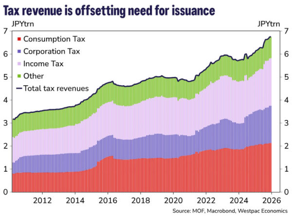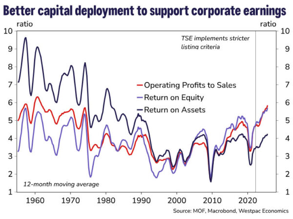 Also assisting revenue growth, will be the impact corporate governance reforms have had on profitability. Over the last three years, the Tokyo Stock Exchange requirements have forced firms to unwind their cross-shareholdings and improve capital efficiency which has seen the return on equity climb to an average of 5.5 in the year to September 2025, compared to an average of 3.4 over 1990–2019 and 4.0 over 1960–90. Combined with a shift in price-setting behaviour and strong export earnings, corporate profits have reached levels unseen since before the Lost Decades. The benefits of these corporate reforms are likely to support profitability and hence corporate tax revenue going ahead.