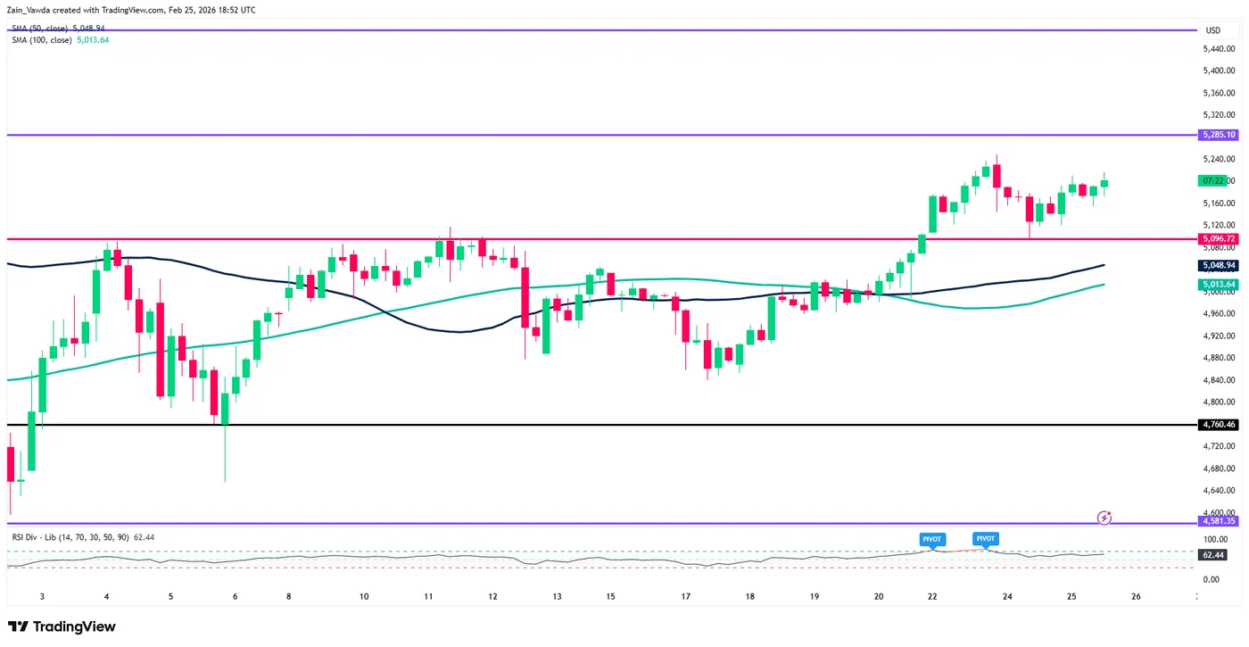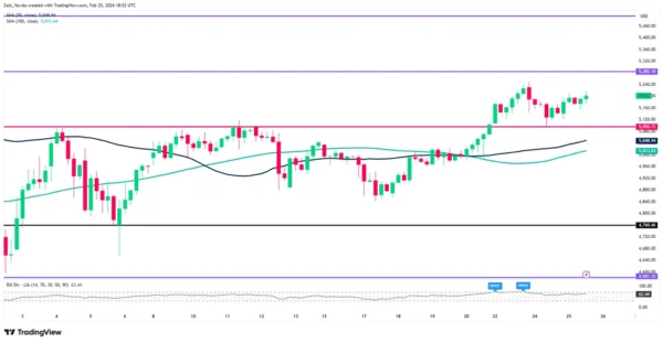 If bulls are able to gain acceptance above this level the next challenge will be to break through this week’s resistance at $5,249/oz. Successfully clearing this threshold would preserve the current “higher highs and higher lows” market structure, potentially sparking a rally toward the $5,300/oz psychological milestone and the January 30 peak of $5,451/oz.