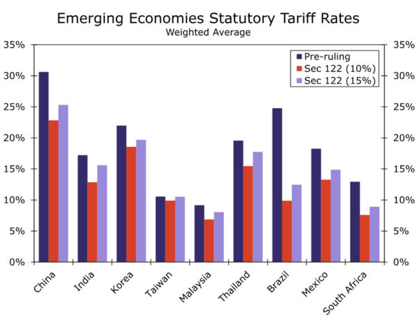 • The binding constraint now comes from Section 122’s flat surcharge (10% as implemented, with 15% still under consideration), applied uniformly across countries.