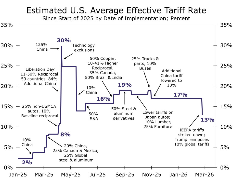 The U.S. weighted average tariffs rate declined to 13% from 17% following the Supreme Court’s February 20 ruling striking down IEEPA tariffs and the administration’s imposition of 10% Section 122 tariffs on February 24 (Figure 1). If the proposed 15% Section 122 surcharge is finalized, weighted average tariffs would rise to around 15%, still modestly below prior levels. This limited relief supports our view of steady global growth amid elevated policy uncertainty and rising idiosyncratic risks (see International Economic Outlook: February 2026).