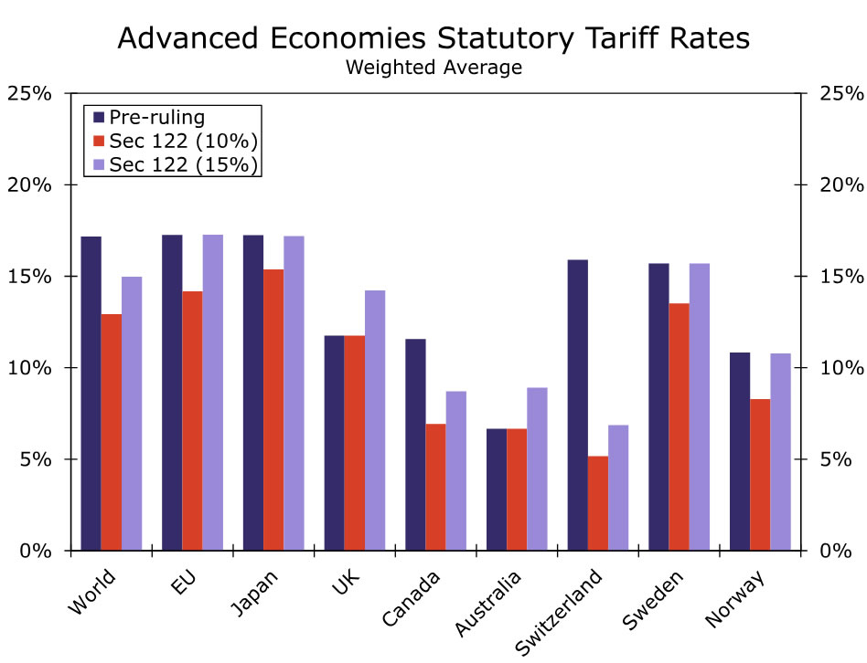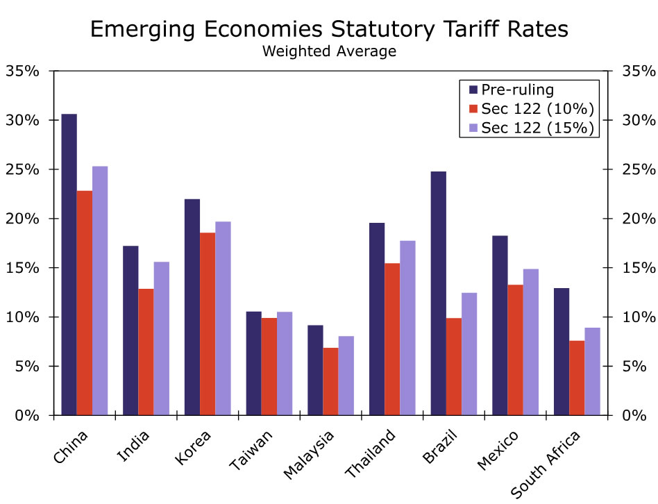 • The binding constraint now comes from Section 122’s flat surcharge (10% as implemented, with 15% still under consideration), applied uniformly across countries.