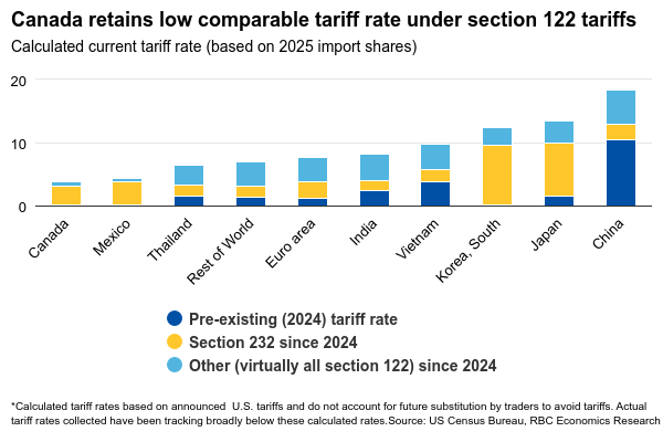 CUSMA exemptions mean Canada should retain among the lowest average U.S. effective tariff, even as significant targeted tariffs remain in effect on products like steel, aluminum and the auto sector (measures not impacted by the U.S. Supreme Court ruling).