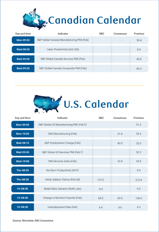 For Canada, we’re watching the February S&P manufacturing Purchasing Manager’s Index on Monday after it ticked above the neutral growth 50 level in January for the first time in a year.