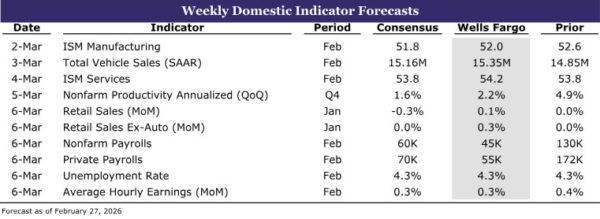 - Next week will bring some key readings on the economy’s early year momentum. We look for the February ISM surveys to show a modest firming in services activity and that the factory sector is continuing to reemerge from the prior year’s slump. Yet, the February employment report is likely to indicate that, while the labor market remains roughly in balance, job growth is struggling more than last month’s jump in payrolls indicated. We believe the temperate labor market backdrop along with adverse winter weather led to a muted rise in January retail sales.