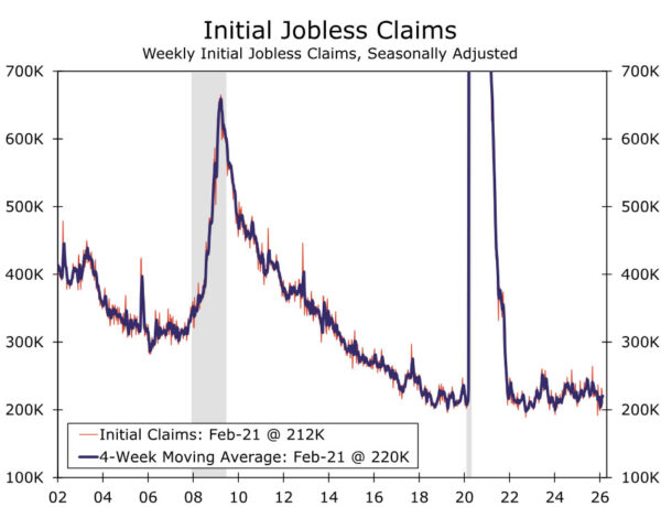 Breaking it down, just 28% of people think “jobs are plentiful,” up slightly during the month but still well off the recent cycle peak of over 50%. This suggests firms are still being cautious on adding to headcounts. But are they reducing payrolls in a material way? “Jobs hard to get” has averaged just 20% over the past several months, up from recent lows but hardly consistent with skyrocketing unemployment. In addition, initial jobless claims declined to 212K during the week ended Feb. 21, further evidence that overall unemployment is not surging higher. The message is that the labor market is currently lethargic, with very slow rates of new hiring. But deep and widespread layoffs (beyond a select few industries) do not appear to be happening either.