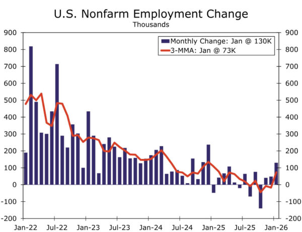 We expect the February employment report to show that January’s robust pace of payroll growth overstated underlying momentum in the labor market. While some stabilization in demand for workers is evident, a range of indicators, including JOLTS and consumers’ perception of job availability, continue to point to a gradual loosening in labor market conditions rather than a renewed acceleration in hiring. We look for nonfarm payrolls to rise by 45K in February, with weakness in weather-sensitive industries like construction and leisure & hospitality and some payback in healthcare & social assistance after a significantly above-trend reading in January.
