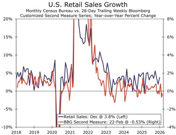 The shutdown-delayed January retail sales report is expected to show spending got off to a modest start in 2026. A large winter storm across the central and eastern U.S. likely crimped activity, with auto sales in January already reported to have fallen to nearly a three-year low. Lower gasoline prices will also have weighed on sales, leading us to expect just a 0.1% increase in total retail sales last month.