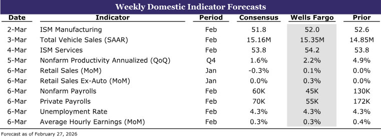 - Next week will bring some key readings on the economy’s early year momentum. We look for the February ISM surveys to show a modest firming in services activity and that the factory sector is continuing to reemerge from the prior year’s slump. Yet, the February employment report is likely to indicate that, while the labor market remains roughly in balance, job growth is struggling more than last month’s jump in payrolls indicated. We believe the temperate labor market backdrop along with adverse winter weather led to a muted rise in January retail sales.