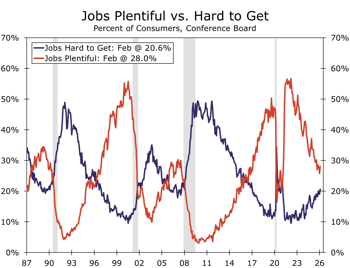 Breaking it down, just 28% of people think “jobs are plentiful,” up slightly during the month but still well off the recent cycle peak of over 50%. This suggests firms are still being cautious on adding to headcounts. But are they reducing payrolls in a material way? “Jobs hard to get” has averaged just 20% over the past several months, up from recent lows but hardly consistent with skyrocketing unemployment. In addition, initial jobless claims declined to 212K during the week ended Feb. 21, further evidence that overall unemployment is not surging higher. The message is that the labor market is currently lethargic, with very slow rates of new hiring. But deep and widespread layoffs (beyond a select few industries) do not appear to be happening either.