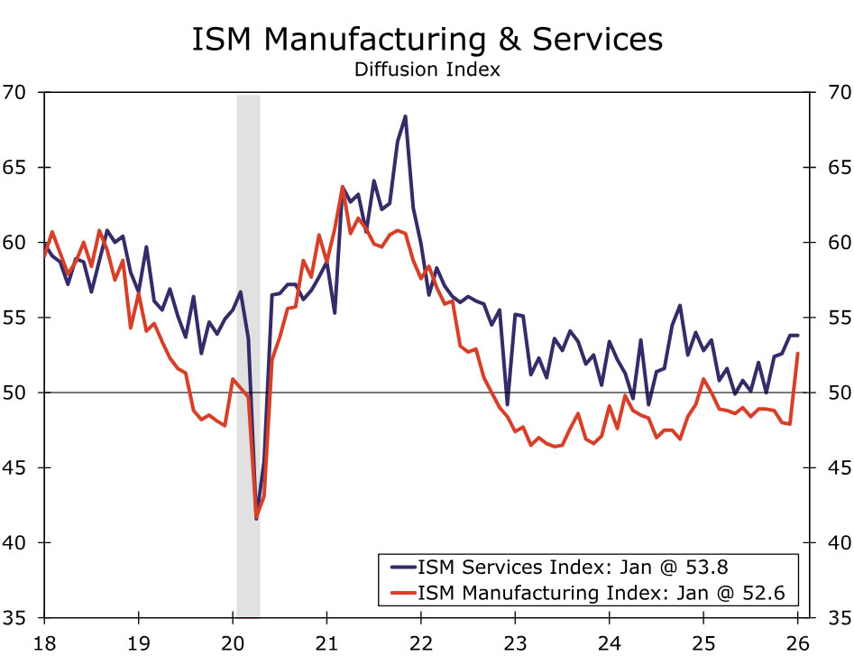 The ISM manufacturing index crossed into expansion territory in January for the first time in 10 months. The improvement comes amid an upswing in capital spending—highlighted by broadening in durable goods orders—as well as restocking efforts in the wake of last year’s tariff hikes. We would not be surprised to see a little giveback in February following last month’s leap, however, and estimate a February print of 52.0. The nearly 10-point jump in the new orders component in January overstates underlying momentum in the factory sector in our view. Regional PMIs for February show manufacturing activity continued to expand last month, but a more even-keeled pace.