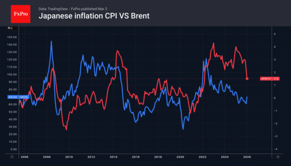 According to Monex Group, a rise in Brent to $100-120 per barrel would be equivalent to a supply shock in Japan and would derail Sanae Takaichi’s efforts to stimulate the economy. In this scenario, inflation will accelerate by 0.5 percentage points. Its slowdown in January-February seemed to have given the prime minister a free hand. However, events in the Middle East risk changing everything, which will affect the USDJPY exchange rate.
