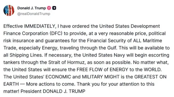 Trump announced a pledge to establish a major security framework to protect commercial shipping routes across the Arabian Sea, with a specific focus on the highly vulnerable Strait of Hormuz.