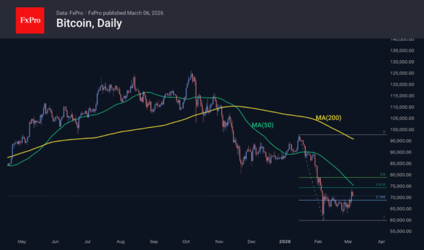 Bitcoin is cautiously retreating for the second day to $70.5K, having encountered resistance and exhausted its growth momentum from the liquidation of short positions a couple of days ago. Short-term obstacles to growth are the 50-day moving average and the 61.8% level of the decline from 14 January to 6 February. Bears are proving that they are in control, keeping Bitcoin within the correction range. In such conditions, there is a higher chance of movement towards the lower end of the range, which can be called typical behaviour for the end of the week in recent months.