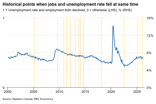 Since 2000, there have been 13 months were employment and the unemployment rate declined at the same time (about once every two years). Importantly, all of those came during periods of stable to improving labour markets, not during slowdowns.
