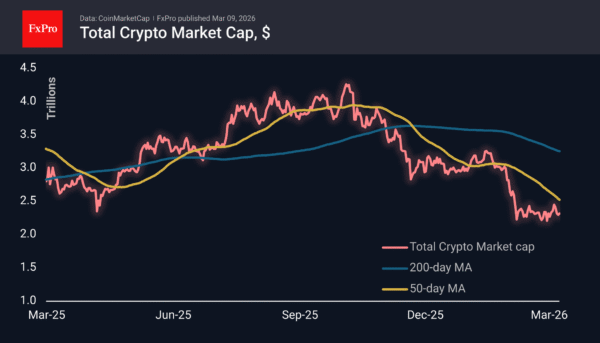 The crypto market cap on Monday morning is $2.31 trillion, just over 1% higher than a week ago. Volatility in cryptocurrencies decreased significantly in the second half of the week, unlike in traditional financial markets. Cryptocurrencies did not emerge as a safe haven; instead, they found only a temporary balance between opposing forces. Last week, crypto failed to maintain its mid-week momentum. They are also avoiding a collapse following traditional markets, which began trading on Monday. This is too fragile a balance, and we see a greater risk of increased cryptocurrency sell-offs as institutional players are forced to reduce leverage amid the decline of key assets.