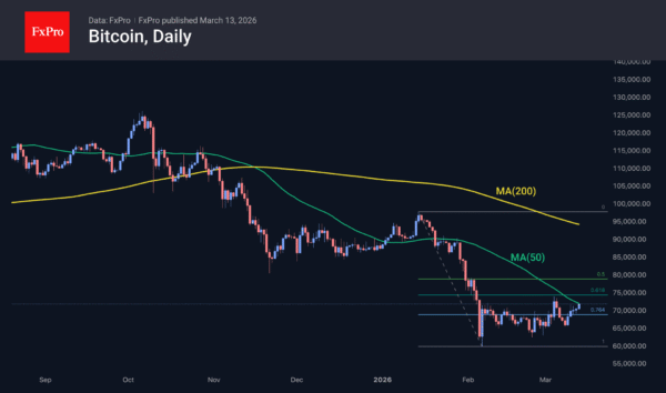 The crypto market cap has risen 2% over the past 24 hours, to $2.43T, close to the upper limit of last month’s range and slightly below last week’s mid-range. We continue to note the positive momentum in cryptocurrencies, in contrast to the pressure on the Nasdaq 100 and gold prices. However, we believe this divergence is short-term and will only continue until traditional markets begin to collapse. At the same time, the markets are now testing key technical support levels, forcing cryptocurrency traders to stay on guard.