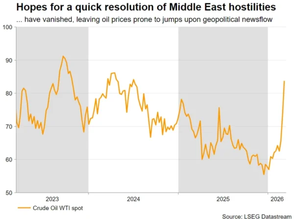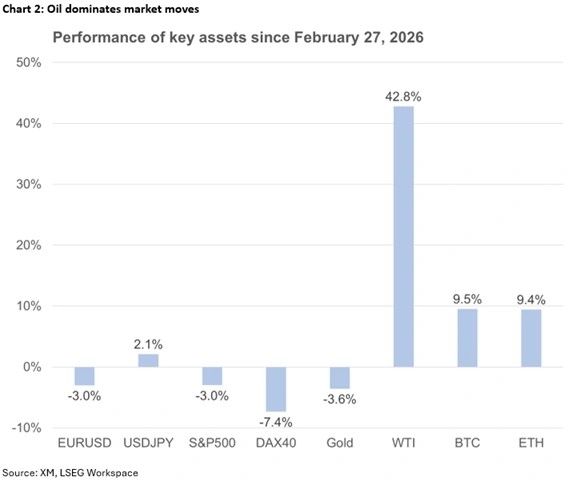Equity indices have been under only modest pressure so far this week. One could say that investors are potentially too optimistic about the US’s ability to secure the Strait of Hormuz, restoring the supply of oil. Surprisingly, cryptocurrencies have been faring better than equities since the start of the Middle East conflict. Bitcoin is up 9.3% since February 27, while the S&P 500 index is down 3% in the same period.