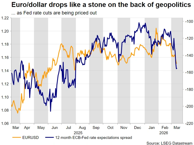The latest developments have completely altered the rate outlook for the two heavyweights. The ECB – being more price conscious compared to the Fed at this juncture – is seen tightening its monetary policy stance by 44bps in 2026, up from just 4bps at the start of the year. This repricing looks exaggerated and has offered little assistance to the euro, which is down 2.6% this month against the dollar, the strongest monthly drop since November 2024.