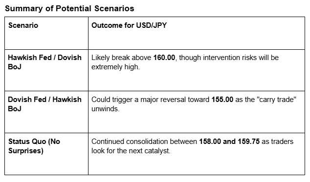 The Impact: The real movement will come from the “Dot Plot” (projections for future rate cuts). If the Fed signals fewer cuts for 2026 due to sticky inflation (currently around 3.1%), the US Dollar could surge, potentially testing the 160.00 level against the Yen