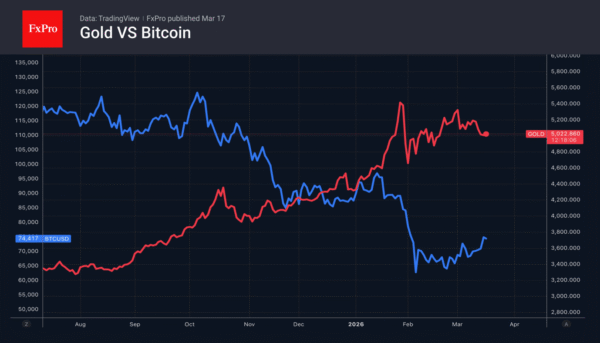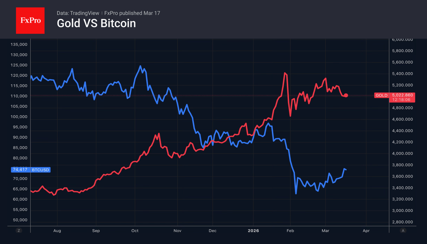 The market is fixated on the threat of accelerating inflation driven by high energy prices. As a result, central banks are expected to adopt a tighter monetary policy, keeping rates at high levels or even raising them. This has a positive impact on fiat currencies and strips gold of its key feature as a store of value amid currency debasement. It is no surprise that the precious metal, which had got off to a strong start, has been losing out to Bitcoin and the US dollar since the start of the armed conflict in the Middle East.