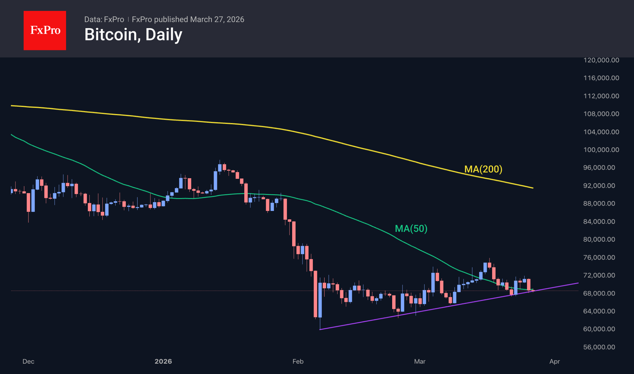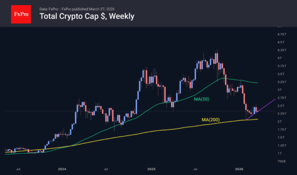 The crypto market’s capitalisation fell by 3.4% over the past 24 hours to $2.36 trillion, remaining close to the uptrend line. The downward momentum was once again driven by stock indices, which returned to their lows at the start of the week. However, whilst the Nasdaq 100 has shown a steady downward trend on weekly charts since late January, cryptocurrencies have been forming a sequence of higher local lows since early February, when the market touched the 200-week moving average – a key long-term trend line.