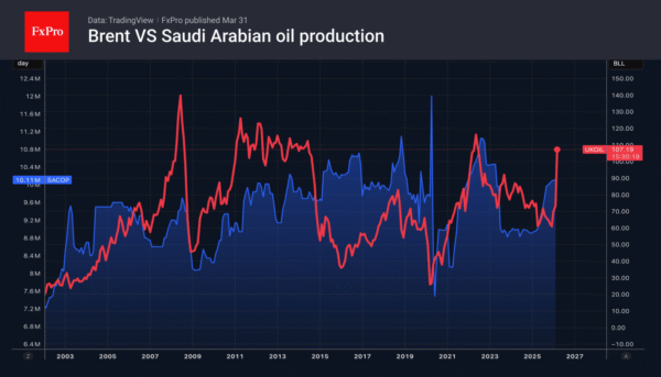 Meanwhile, according to Société Générale, Brent risks rising to $150 per barrel in April, with an average price of $125. A closure of the Bab al-Mandab Strait by the Houthis could push prices higher. Saudi Arabia has managed to bypass the Strait of Hormuz and deliver 6 million BPD via alternative routes. However, new difficulties will automatically force Riyadh to cut production.