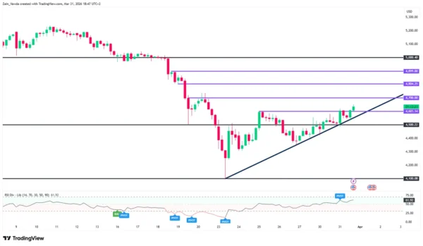 • Support: The recent pivot at $4,500 remains a crucial psychological floor. As long as the ascending trendline holds, the bullish structure remains intact.