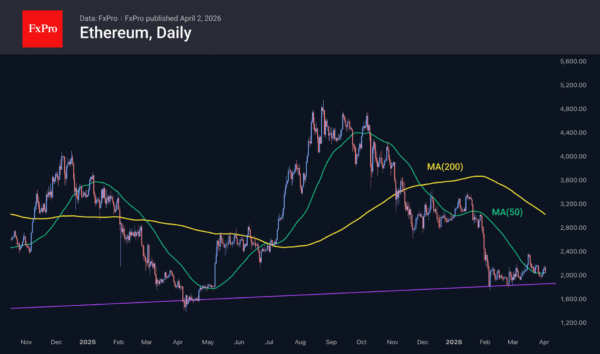 Ethereum looks slightly more confident, remaining above the $2K round figure, above the 50-day MA and the support line of the multi-year trend. Should pressure on the crypto market intensify, it will be worth monitoring whether the second-largest cryptocurrency can hold above $1.8K. A break below this level would be a significant bearish signal, potentially triggering sell-offs across a wider range of coins and bringing an end to the crypto market’s recent resilience to external threats.