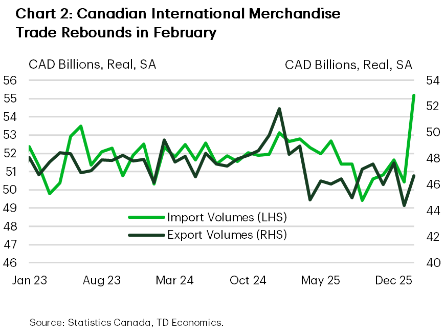February’s international merchandise trade data also gave us another look at Q1 growth conditions. It was a sturdy month, as both exports and imports sharply reversed course from last month’s sagging activity (Chart 2). Gains on both sides of the ledger were broad-based as most subsectors booked a gain, though a bounce-back in auto-sector activity did a lot of the heavy lifting. The recent meteoric rise in oil prices will start to show up in the March data, boosting nominal trade momentum into the second quarter, which should help narrow Canada’s trade deficit. Elsewhere in trade, Canadian representatives are slowly re-engaging U.S. counterparts after a quiet few months, with hopes of smooth negotiations ahead of the July 1st CUSMA review.