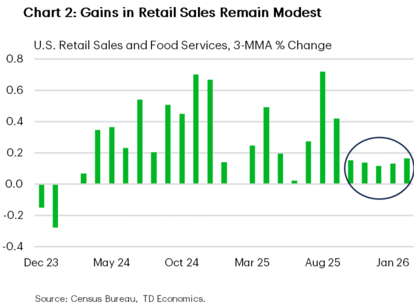 Consumer spending has stayed relatively resilient, but households are inflation-weary and showed caution even before the latest surge at the pump. Retail sales rose 0.6% m/m in February after two months of stagnation (Chart 2). Adjusted for inflation, sales volumes are up only 1% from a year ago. Larger tax refunds may help mitigate higher gas prices, but slower hiring and equities selloff could still weigh on consumption.