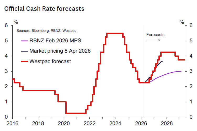 Hence, we are bringing forward our existing 25bp per meeting tightening profile to begin in September. The OCR will thus end 2026 at 3% and reach the previously expected 4.25% peak earlier, in September 2027. Easing is forecast to begin a year later in September 2028 with the neutral OCR reestablished in December 2028.