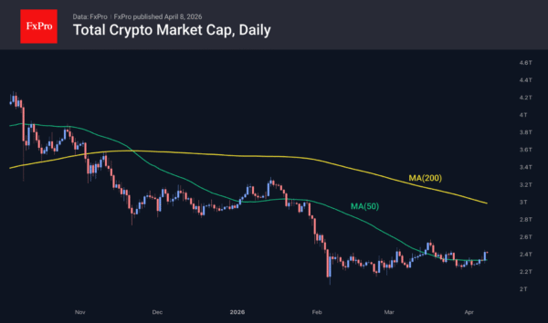 Bitcoin slipped above $72.7K on positive news from the Middle East, retreating slightly at the time of writing to $71.8K, up 4.8% over the past 24 hours. This consolidation above the 50-day MA and a move above the late-March highs are setting an optimistic tone. The immediate focus remains on the $75K area, near which lies the 61.8% resistance level of the latest downward impulse and two March pivot points