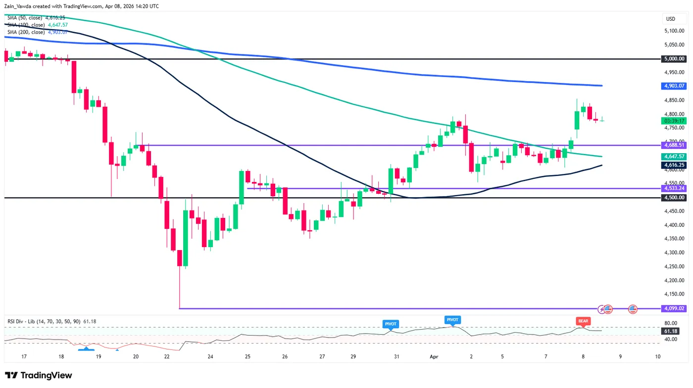 - Gold (XAU/USD) rallied to near $4,850/oz after the US-Iran ceasefire and subsequent oil price slide, but stalled and pulled back toward $4,780 due to concerns over the truce’s fragility.