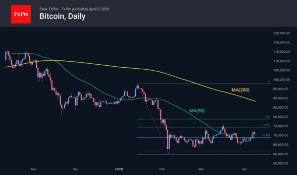 Bitcoin made a fresh attempt to breach $73K on Wednesday but once again encountered a strengthening sell-off, retreating to $71K by the start of active European trading. BTC remains above the 50-day moving average, which has already turned upwards, reinforcing the short-term bullish sentiment. However, we will need to wait for the price to rise above $75K before we can speak of the market entering an active bullish phase.