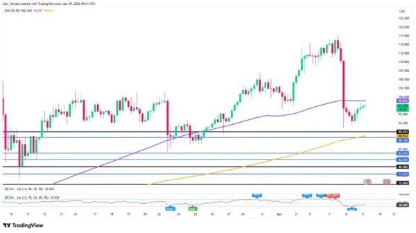 WTI crude (US Oil) is currently undergoing a “reality check” following the massive sell-off from the $115.00 peak. On the H4 chart, the price action has found immediate support around the $94.00 – $95.00 zone, but the recovery is struggling to clear the 100-period SMA (purple line) currently sitting at $98.89.