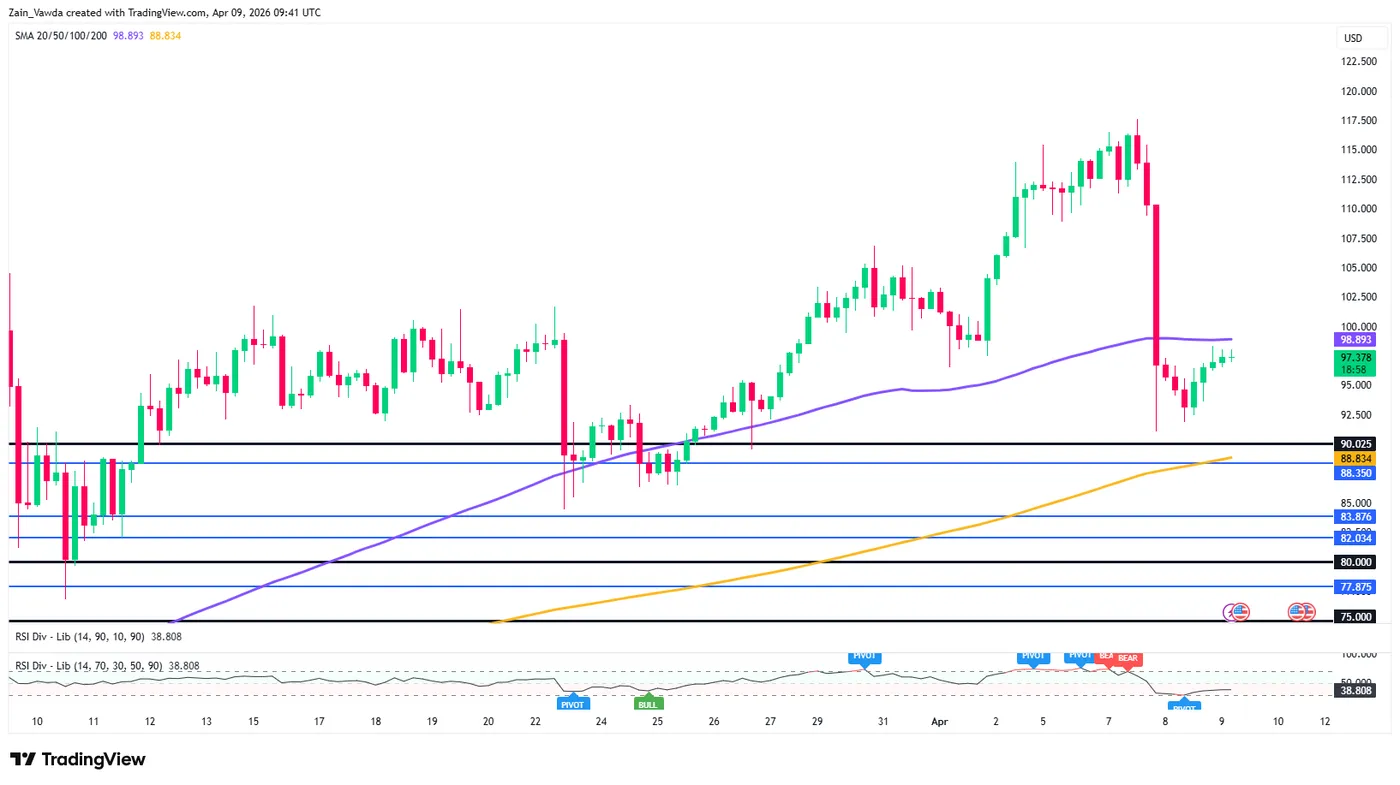 • Support: Failure to hold $94.00 could see a swift slide toward the 200-period SMA (yellow line) near $88.83, which aligns with the key psychological and structural support at $90.00.