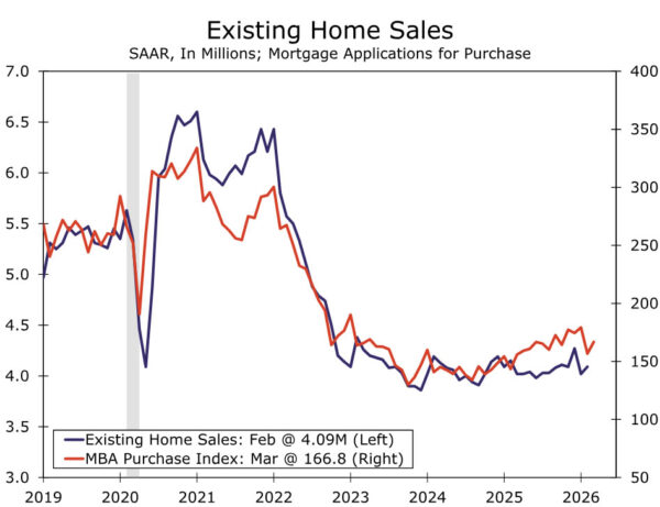 Next week kicks off with the latest read on residential activity. The recent spurt in mortgage rates ahead of the critical spring selling season has placed housing in the spotlight. We note that existing sales measure contract closings, which typically take a month or two to complete. And so, March’s existing sales report will largely reflect conditions that predate the Iran conflict and the resulting ~40 bps increase in mortgage rates.