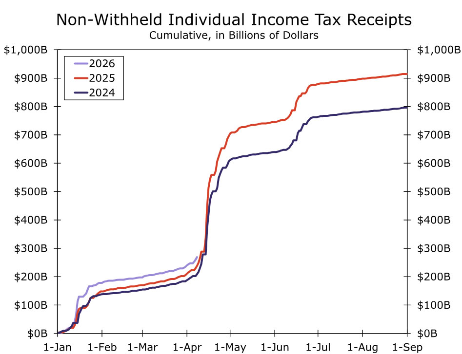 Next Wednesday marks the official end to the 2025 tax season. To date, non-withheld income tax receipts (the amount of money flowing into the Treasury from households) haven’t shown any major surprises and are tracking along pretty smoothly compared to previous years (chart).