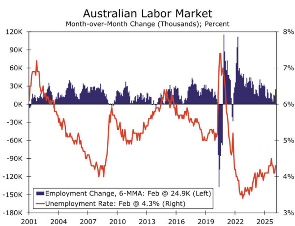 Next week’s Australian employment report for March should offer an early read on economic conditions in early 2026, as it is the first labor market release to partially overlap with the onset of the Middle East conflict. That said, it remains too soon for the data to materially affect the RBA’s Cash Rate outlook, given any momentum would largely predate the conflict. In February, the unemployment rate edged up to 4.3% from 4.1%, even as employment rose by 48.9K, driven entirely by gains in part-time jobs that more than offset declines in full-time employment. For March, consensus expects the unemployment rate to hold steady, with job gains slowing to 17.8K.