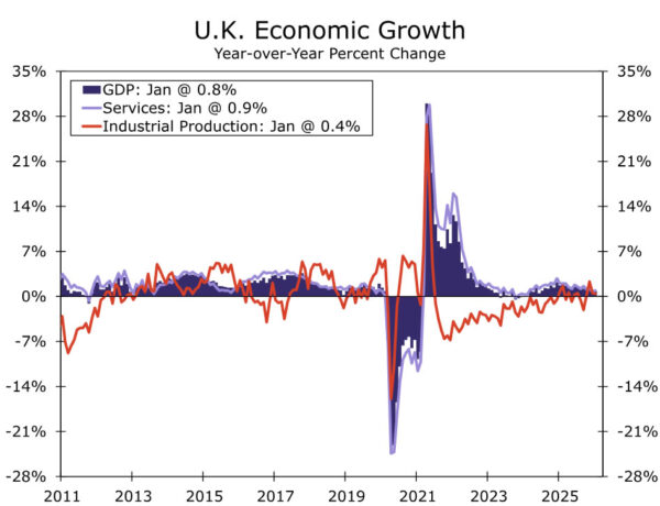 We expect UK’s February GDP to rise 0.1% month-over-month, following a flat print in January. Despite the modest improvement, the outlook for Q1-2026 remains subdued after a weaker-than-expected January and a pullback in retail sales volumes in February. Growth is likely to be mixed across sectors, with some gains in industrial production and services largely offset by weakness in construction. February PMIs were broadly unchanged to slightly weaker compared with January, with the notable exception of construction, where activity declined more sharply. And even if growth were to surprise to the upside, the data predate the escalation of the conflict, which is likely to limit the weight policymakers place on the release.