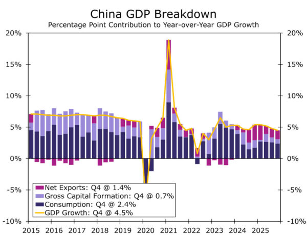 But even if growth and activity surprise to the upside, repeating the 5% growth that was achieved last year will be challenging for China. As we have noted in the past, China has limited policy tools and less willingness to use policy support to spark activity due to negative tradeoffs. A real estate correction is still underway, which should be apparent when home price data are released, and tariffs and trade tensions with the U.S. also complicate China’s ambitions as world supplier. For now, we forecast China’s economy to grow 4.5% this year, and risks are tilted to the downside given the rise in energy prices. Perhaps Q1 gets off to a better start than we expect, but the later quarters may exhibit the bigger drag on overall growth.
