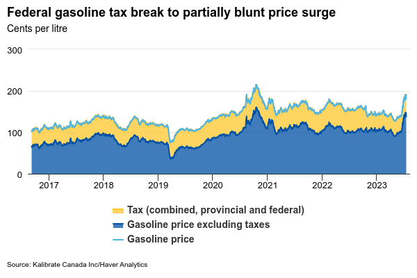 Annual energy inflation will likely rise above 0 for the first time since spring last year when the cancellation of the federal consumer carbon tax sent prices lower in April. In March, gasoline prices were up 6.8% from a year ago on average, but would have been up 23% without the impact of that tax change.