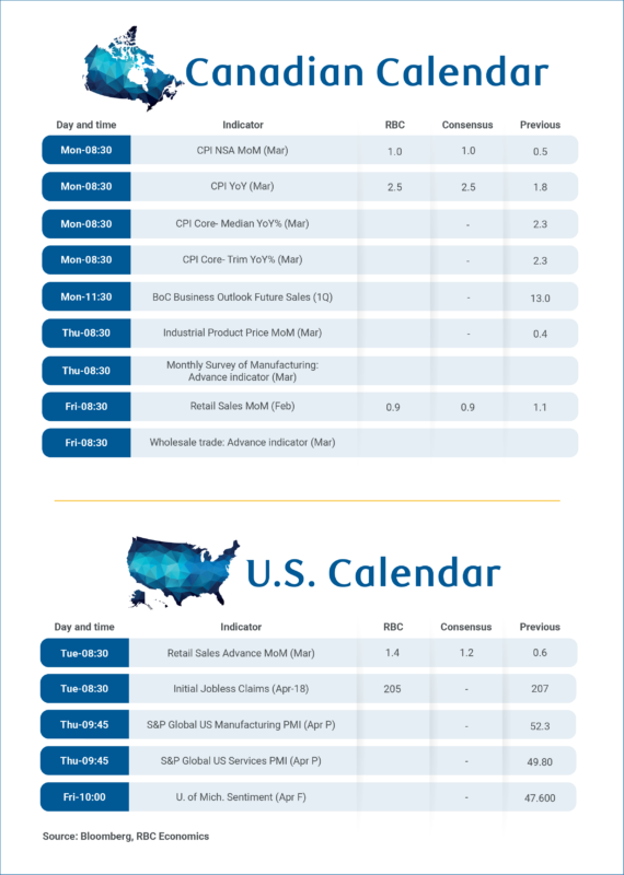 Higher gasoline prices in March in Canada —up 21% from February—are expected to push year-over-year growth in the headline Consumer Price Index up to 2.5% from 1.8% in February, while inflation excluding food and energy ticks slightly higher to 2.2%.