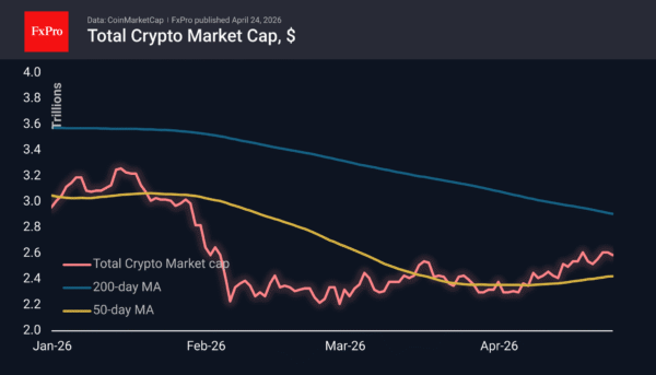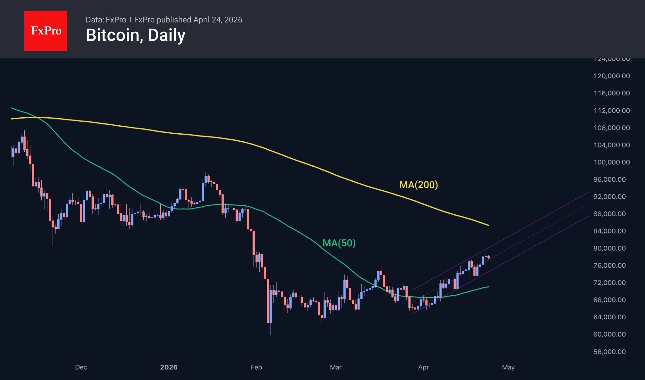 Bitcoin continues to consolidate around $78K. Attempts to push prices below $77K have met with confident buying. The leading cryptocurrency remains in an uptrend that began in early April, with fairly active buying on dips, and the price is currently roughly in the middle of this channel, which ranges from $75.6K to $80.5K. If this pace continues, it will take just over two weeks to reach the 200-day moving average, but we expect to see an acceleration in growth soon, along with more intense fluctuations in key indicators of the long-term trend.