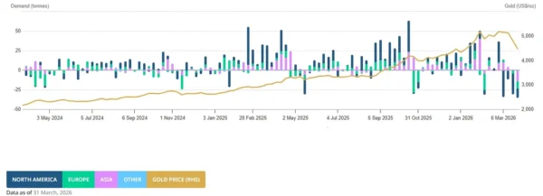 As a result, the entire first quarter ended with only modest net inflows, significantly lower than a year earlier. This may limit overall demand for gold, which in 2025 exceeded 5,000 tonnes and reached a record level, supported largely by strong purchases of bars and coins.