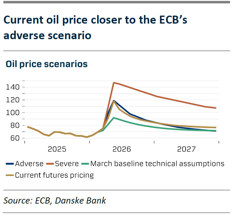 Since the March meeting, headline inflation increased as expected while the PMI data was weaker than expected, but with a sharp rise in price components (charts 1 and 2). Oil contracts for April and May are close to the ECB’s ‘adverse’ scenario while futures have fluctuated and are now close to the adverse scenario (chart 3). The inflation outlook is thus closer to the ‘adverse’ scenario which supports our view of two hikes, as around 35bp worth of hikes was included in the projections’ technical assumptions. The ECB’s communication is still relatively hawkish, and they signal that curbing upside price pressures carries more weight than mitigating deteriorating growth prospects. Moreover, we anticipate rate increases to ensure inflation expectations remain anchored. We therefore expect the ECB to raise policy rates by 25bp at the June and July meetings, bringing the deposit rate to 2.50%.