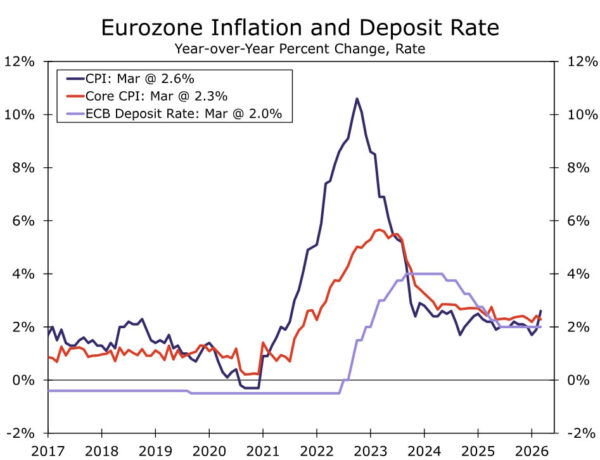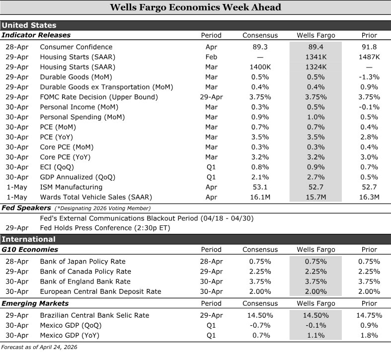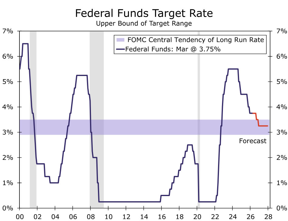 The Fed’s dual mandate remains in tension. Recent data point to PCE inflation remaining stuck around 3%, with the energy shock from the conflict in the Middle East expected to strengthen headline inflation in the near term. Meanwhile, the labor market continues to lose momentum. First‑quarter job growth was distorted by strikes and volatile weather, and we expect hiring to slow further in coming months as renewed geopolitical uncertainty restrains labor demand. Against this backdrop, we expect the Fed to remain patient and hold the federal funds target rate steady at next week’s meeting.